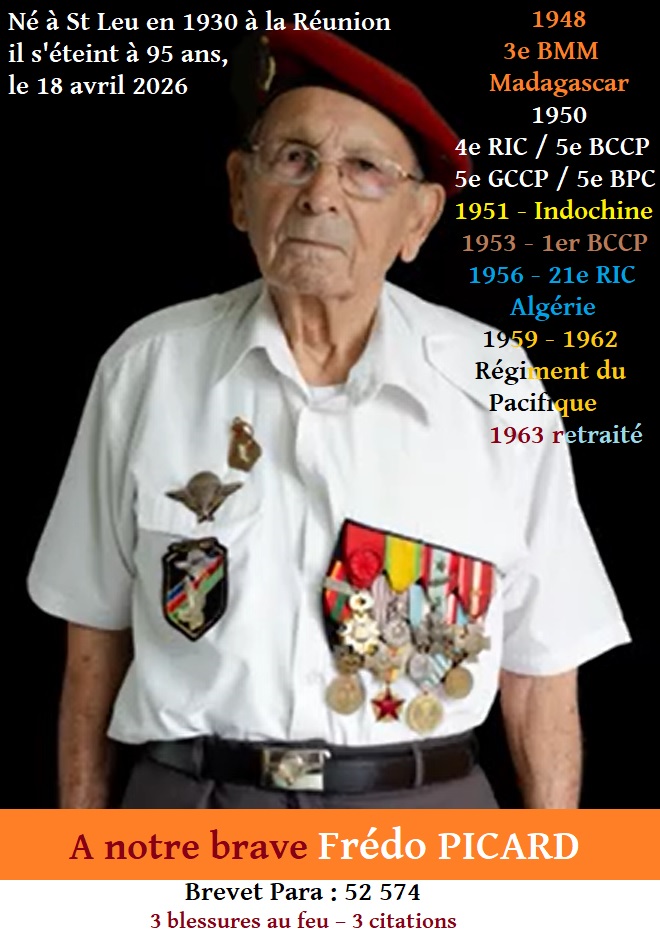 Chers Amis, c’est avec une profonde tristesse que nous vous annonçons le décès de notre ami Frédo PICARD, survenu dans la nuit du 18/04/26. Il aurait eu 96 ans au mois d’août. Frédo était un être cher aux yeux de tous. Fidèle parmi les fidèles, il était un fervent adhérent de l’UNP et a été, durant de nombreuses années, membre de notre amicale. Sa présence, sa gentillesse et son esprit de camaraderie laisseront un souvenir précieux dans nos cœurs.