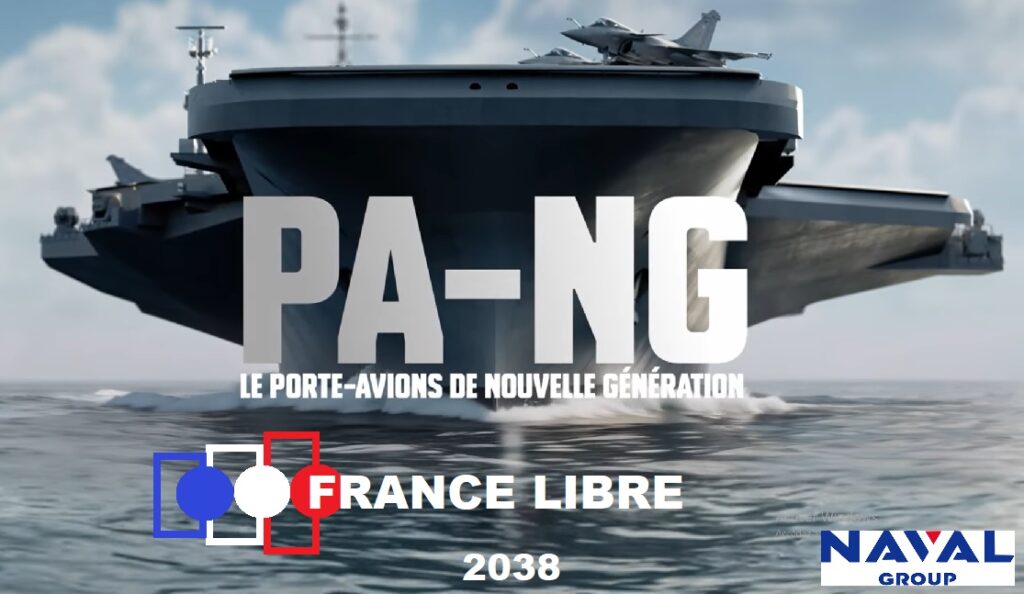 Projet 2038 – Le PAN-NG (Porte Avion Nouvelle Génération) dont le nom officiel de baptême annoncé par le Président sera la « France Libre« . 310m – 78000 T de puissance dernier cri.