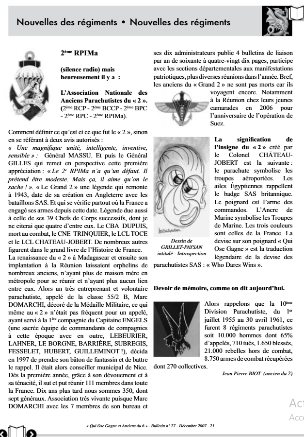 Le Bulletin de Liaison N°27 décembre 2007 en page 21 de « Qui ose Gagne » & Anciens du 6″, Ou l’on évoquait le « Grand 2 » et l’ancienne Association (ANAPC 2) avant restructuration ! Texte de Jean Pierre BIOT « Ancien du 2 ». >>> En savoir plus sur la période 2e BCCP en Cochinchine : ICI